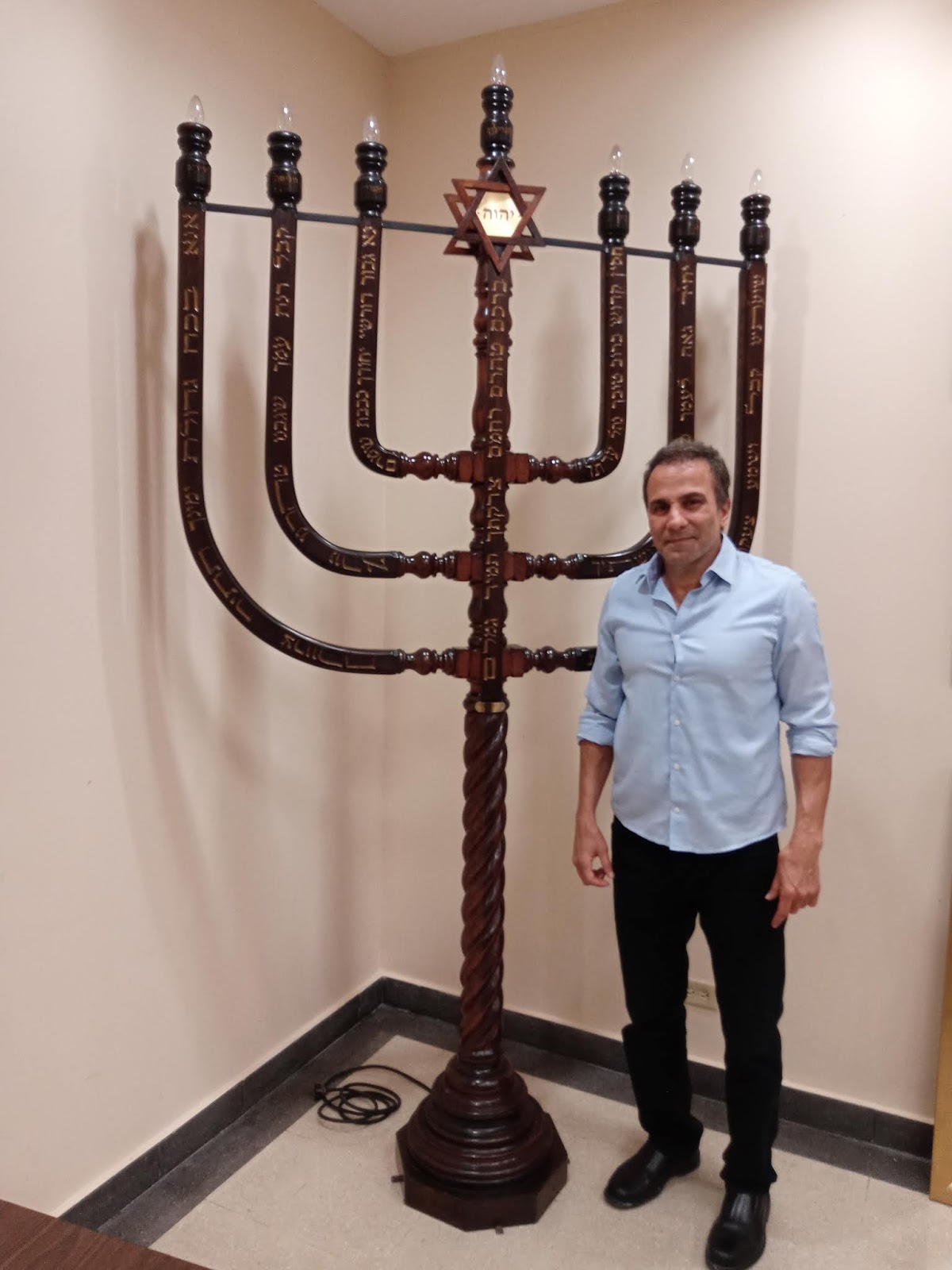| Sión Gadeloff con la gran Menorá de madera tallada. Fotos: Robert Jacobvitz. |