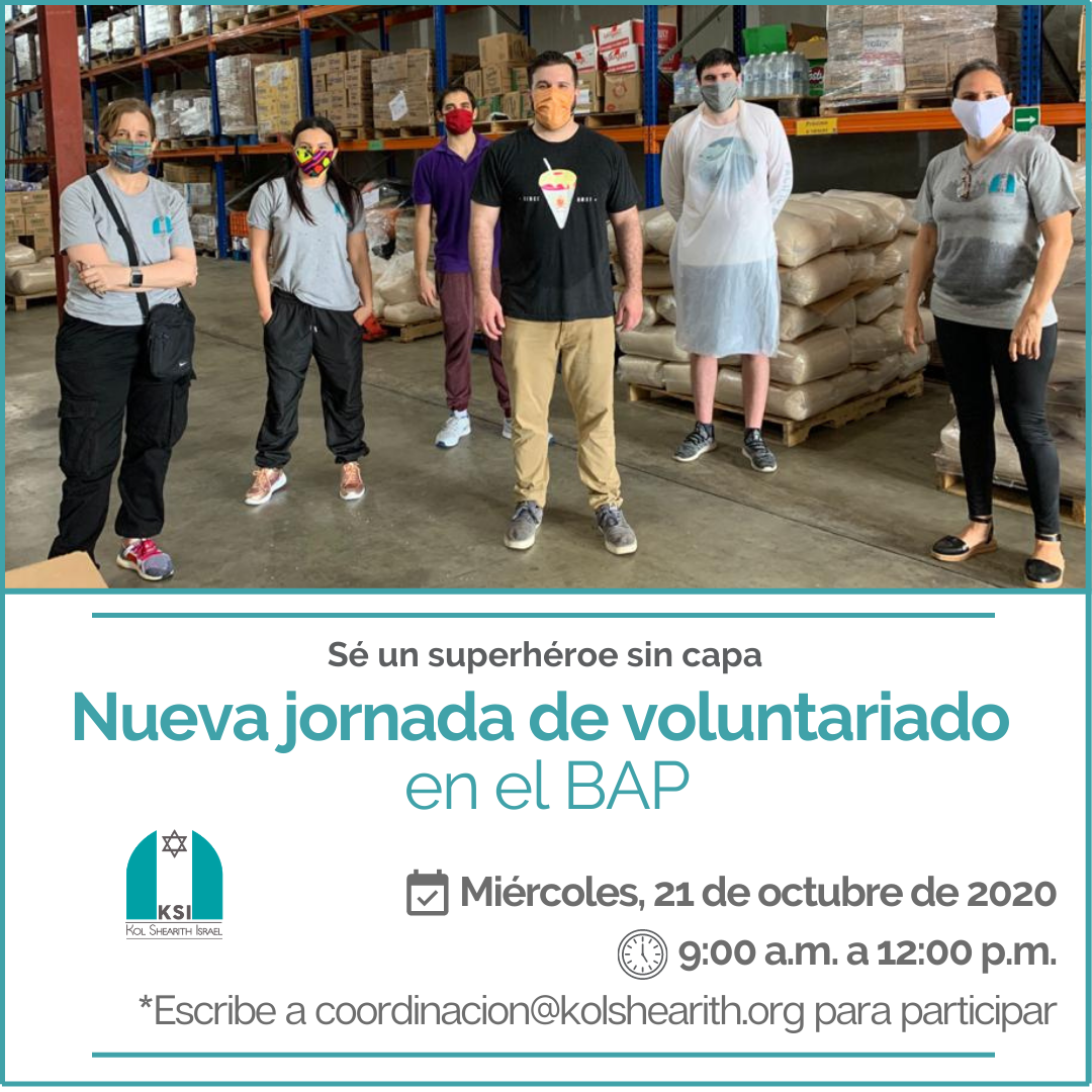 La próxima cita de voluntariado será el miércoles, 18 de noviembre, de 9:00 a.m. a 12:00 p.m. en la sede del BAP. Para inscribirse, por favor escriba a coordinacion@kolshearith.org.