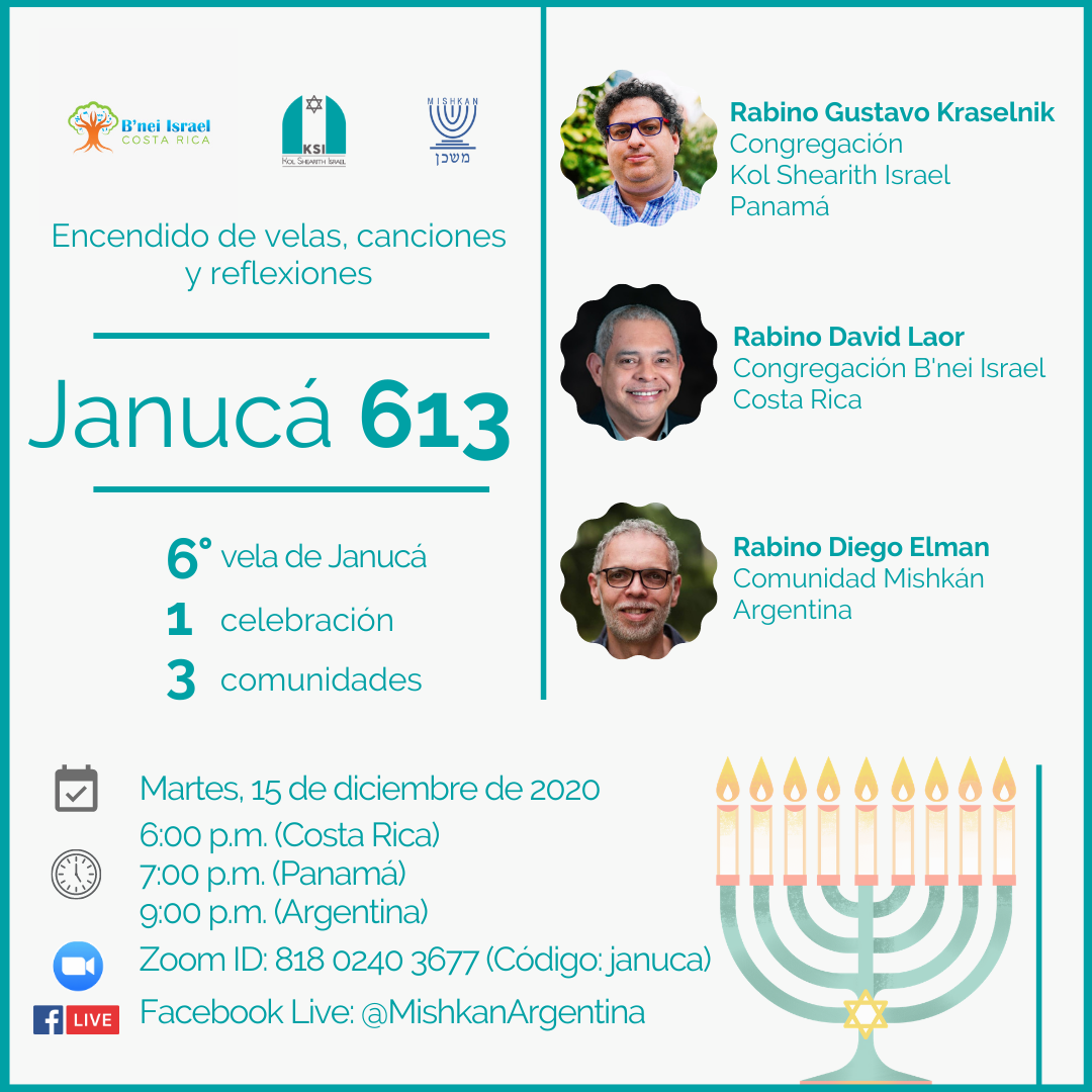 En un esfuerzo conjunto con las comunidad B’nei Israel de Costa Rica y Mishkán de Argentina, el pasado martes, 15 de diciembre, llevamos a cabo la actividad Janucá 613: 6° vela, 1 celebración, 3 comunidades.