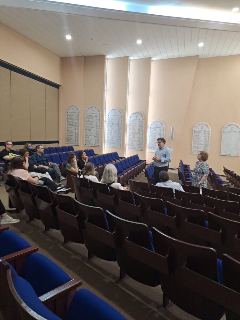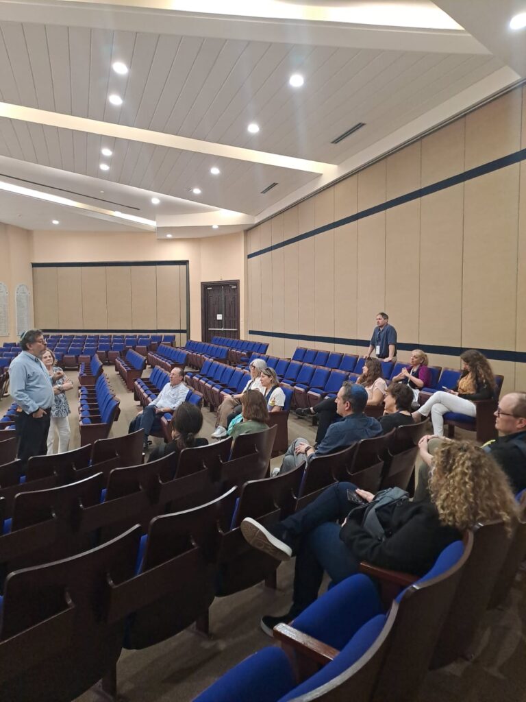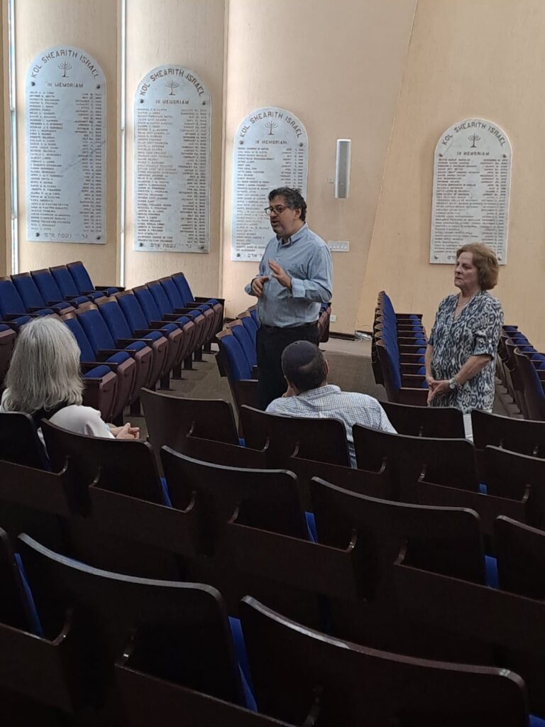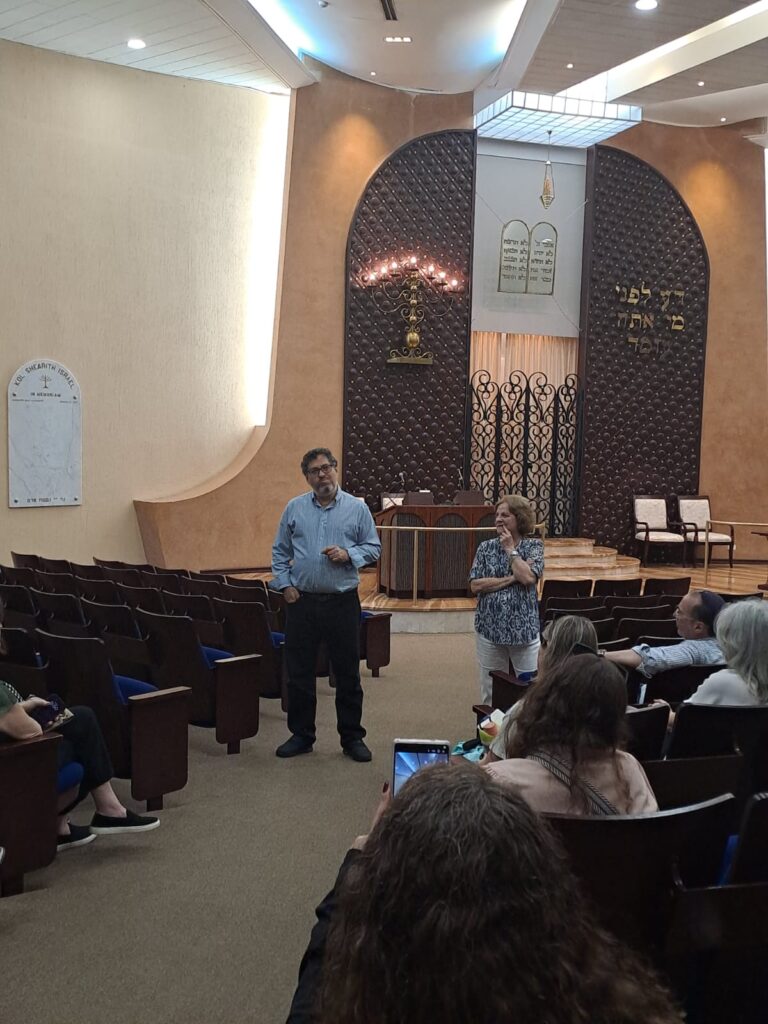 Durante la visita, los participantes realizaron un recorrido por las instalaciones del centro comunitario y recibieron una presentación histórica detallada a cargo del rabino Gustavo y Sherrie Maduro, presidenta de la Junta Directiva de KSI. En su exposición, compartieron con los visitantes las raíces históricas de la comunidad judía en Panamá, su desarrollo a lo largo del tiempo y su impacto en la vida nacional, destacando el valor histórico de Kol Shearith Israel como la sinagoga más antigua del país.