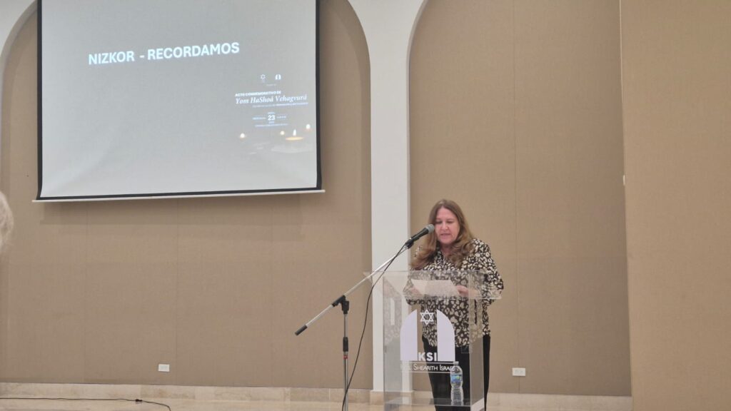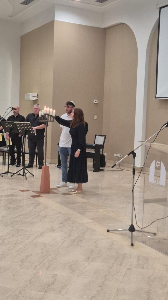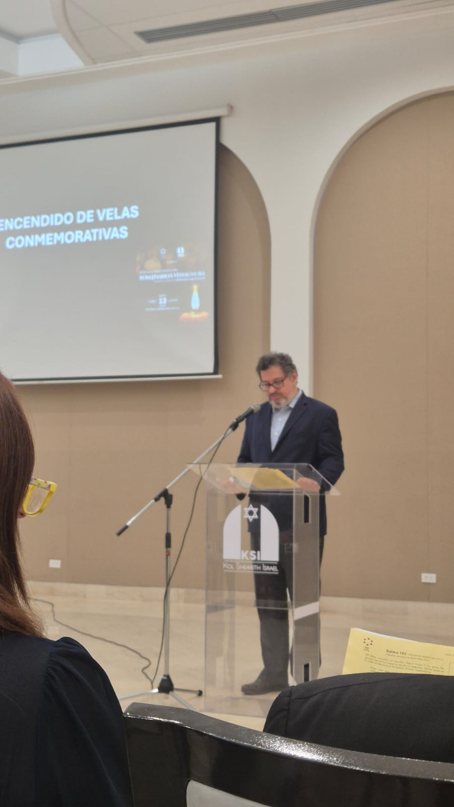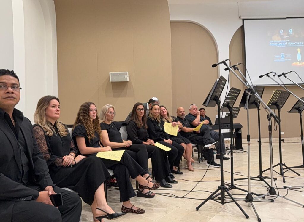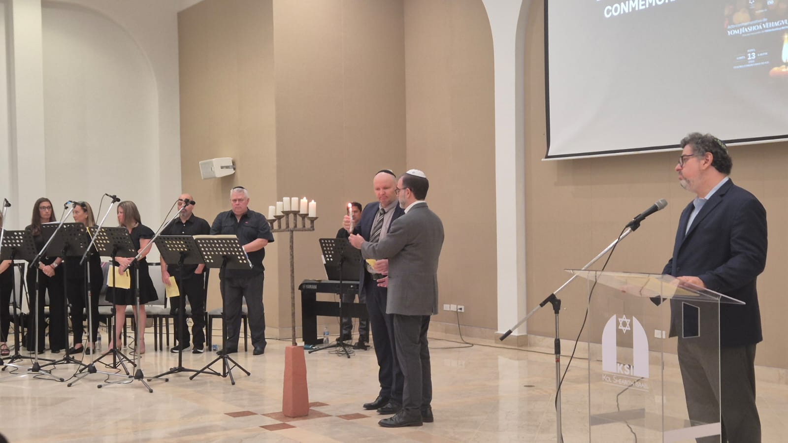 Ya en el salón, el acto continuó con lecturas alusivas al Holocausto, plegarias de recordación y momentos de profunda reflexión. La música del coro Kol HaNeshamá de KSI acompañó la ceremonia, elevando el sentimiento de solemnidad y conexión espiritual.