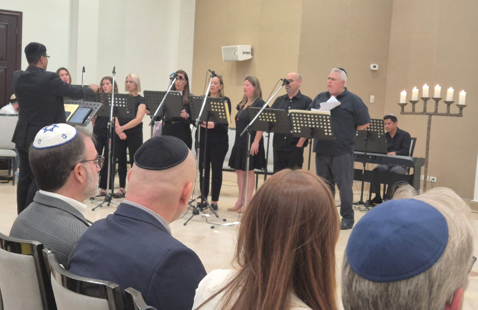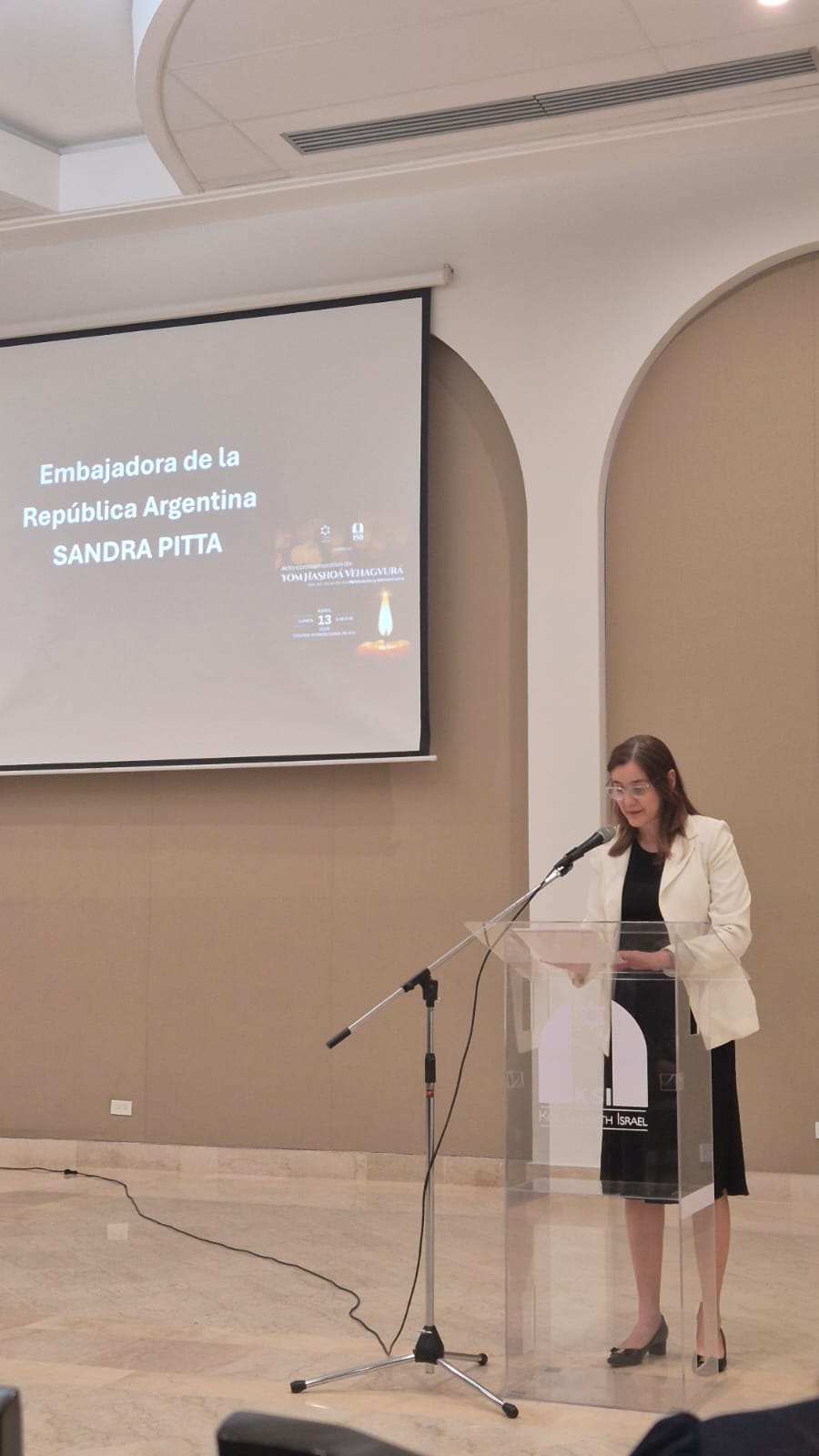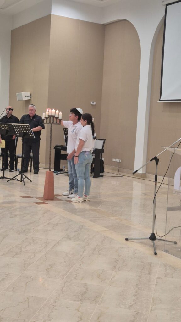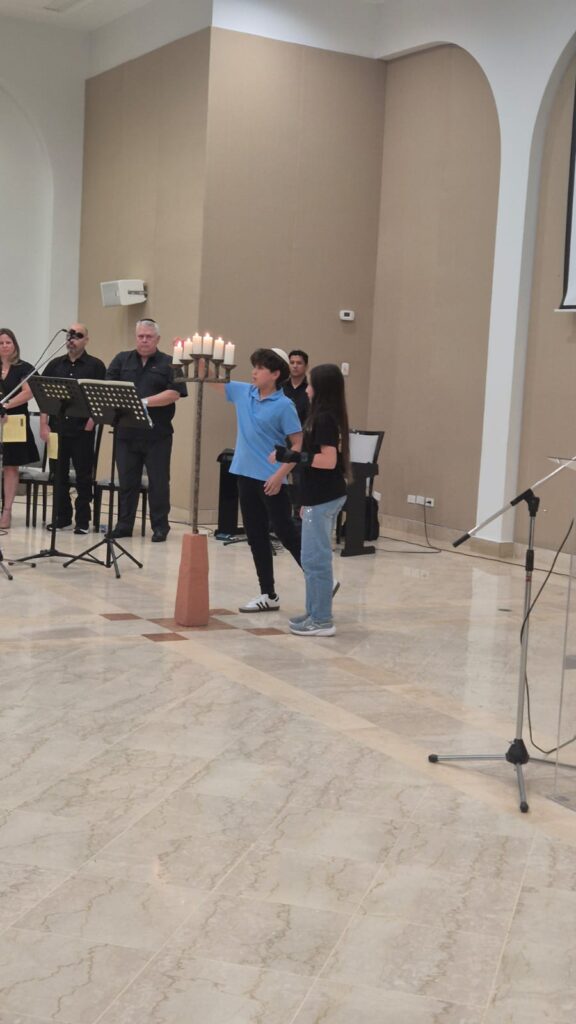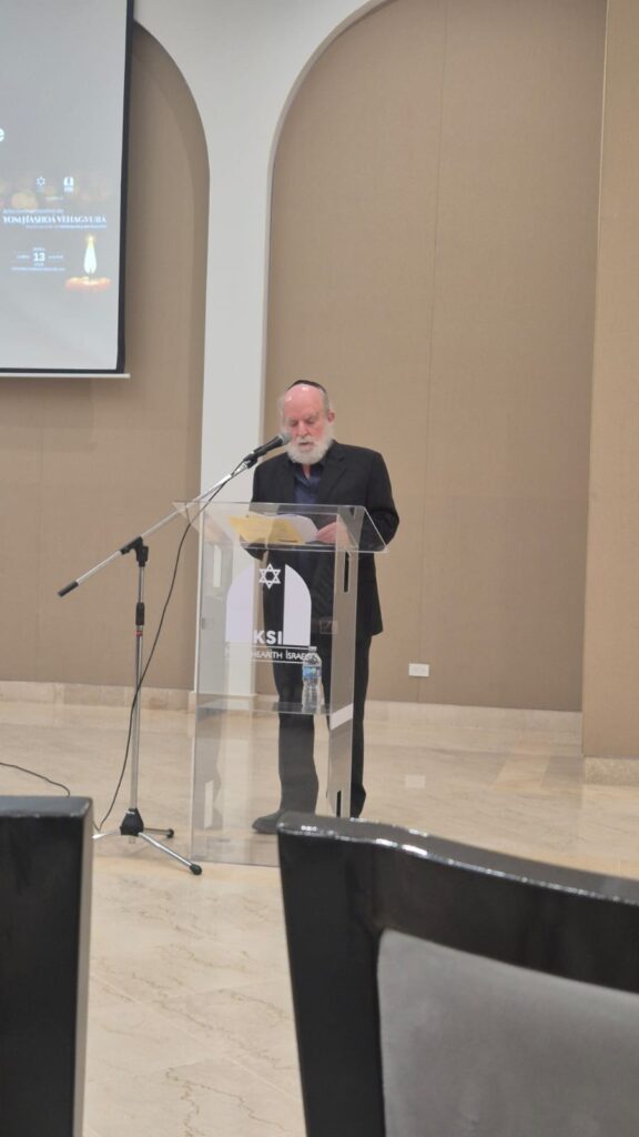 Ya en el salón, el acto continuó con lecturas alusivas al Holocausto, plegarias de recordación y momentos de profunda reflexión. La música del coro Kol HaNeshamá de KSI acompañó la ceremonia, elevando el sentimiento de solemnidad y conexión espiritual.