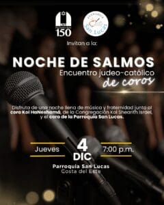 Próximas actividades Noche de Salmos: encuentro judeo-católico de coros Leer más Majané Darkeinu 2025 Leer más Cine-foro de la semana: Dog Day Afternoon Leer más Celebración del 150° aniversario de la Congregación Kol Shearith Israel Leer más
